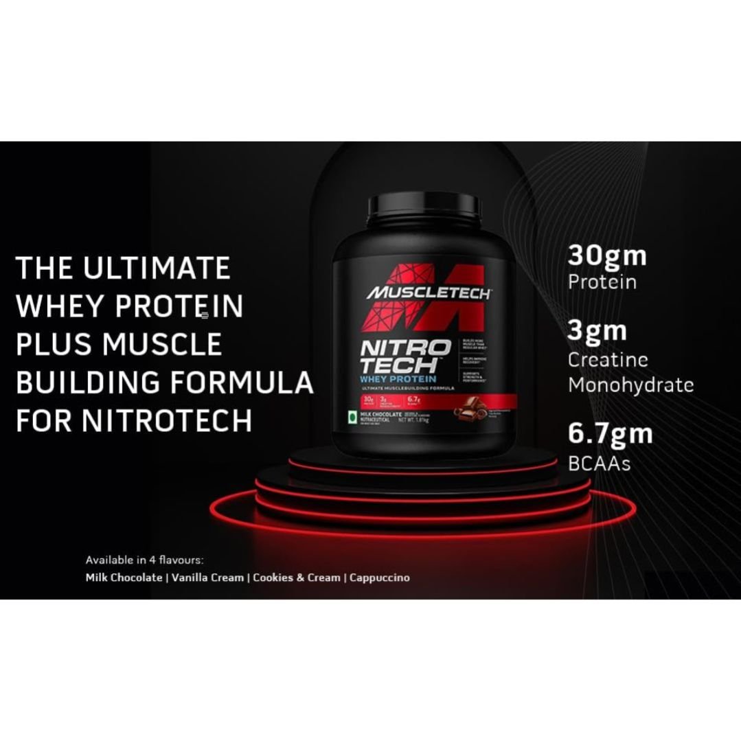 MuscleTech Nitro-Tech Whey Protein, 1.81kg (4lbs), Milk Chocolate, 30g Protein, 3g creatine monohydrate, 6.7g BCAA, ultimate muscle building formula, increase strength & performance