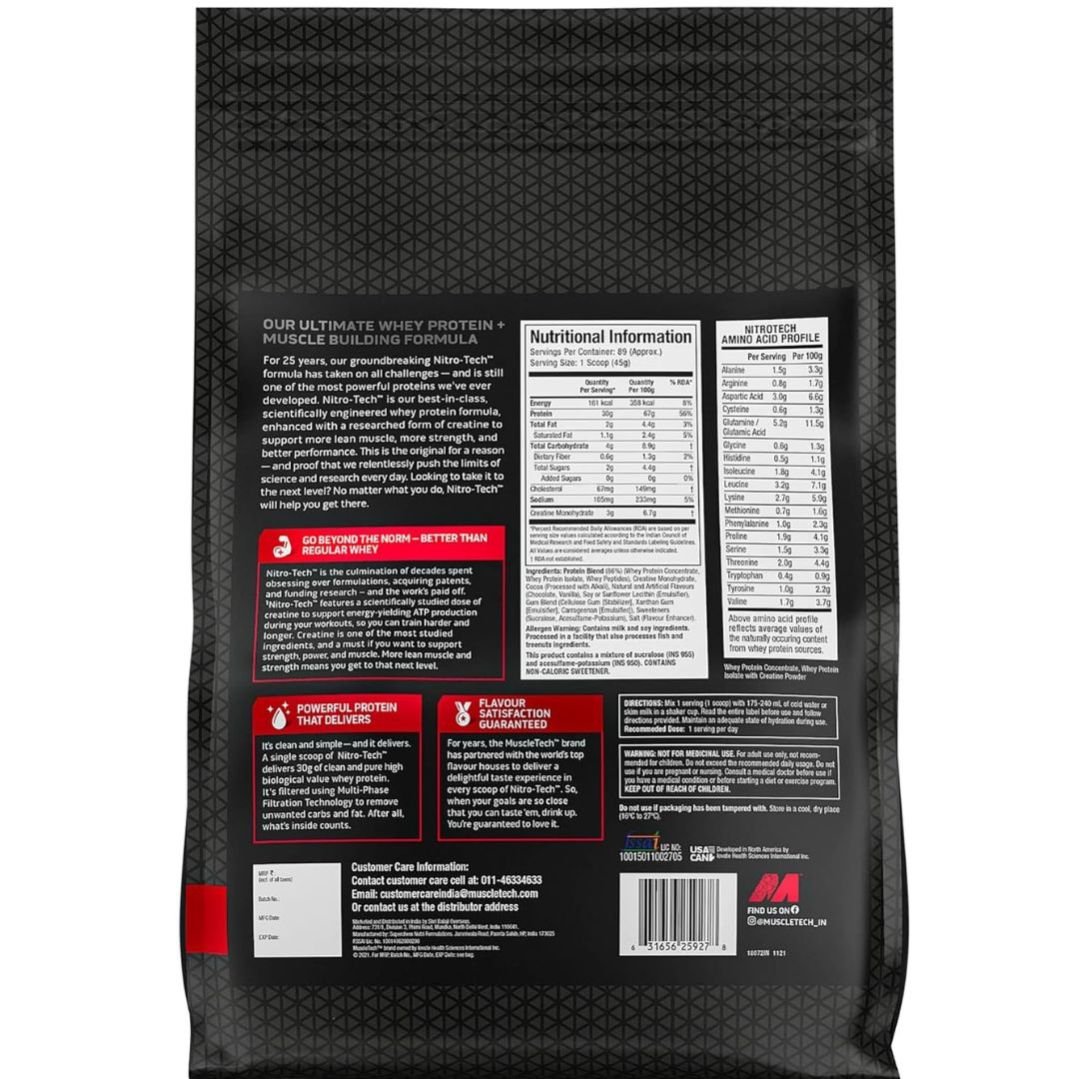 MuscleTech Nitro-Tech Whey Protein, 4kg, Milk Chocolate, 30g Protein, 3g creatine monohydrate, 6.7g BCAA, ultimate muscle building formula, increase strength & performance